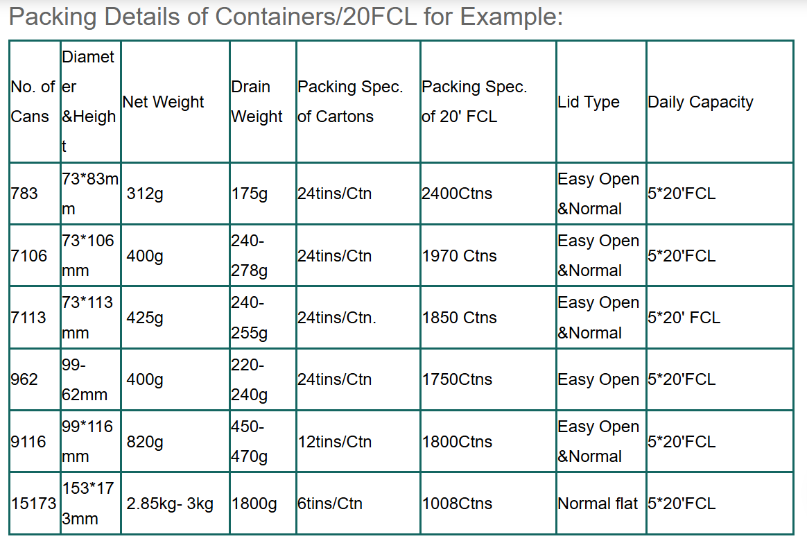 Specification 340g/425g/820g/2500g/3000g